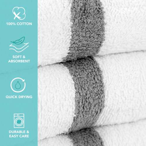 POWER GYM BATH TOWEL: Arkwright's quick-drying bath towel collection is made of 100% cotton. These top-rated small light bathroom towels were initially designed as commercial gym bath towels, and are popular hotel pool towels. Complete your towel set with our power bath towels for the bathroom. POWER GYM BATH TOWEL VALUE PACKS: Pick up an economy set of 12 white 22" x 44" gym towels with a color center stripe. Our highly absorbent quick drying bath towels are available in plain white and blue, beige, pink, green, gold, and grey stripe. A BETTER BATH TOWEL DESIGN: Arkwright's Power bath towels are made from virgin fiber 12/S open-end yarn. Standard absorbent gym towels are made from inferior blended (virgin & reclaimed) fiber yarn. There's a visible difference in the structure of our white bath towels. Power gym towel's loop pile is low, uniform, and tight, with more loops-per-square-inch than competitive towels. MULTI-PURPOSE BATH TOWEL: Our Arkwright's white quick dry towel makes a terrific gym bathroom towel, VRBO guest bath towel, or hotel pool towel. Use as an oversized hand towel in powder rooms, or to dry hair as salon towels. CARING FOR YOUR POWER BATHROOM & GYM TOWEL: These white power bath towels are machine washable on gentle cycle. Do not use bleach. Tumble dry low. Do not iron. Our soft, lightweight gym towels are easy to wash and can hold up to multiple washes without thinning or unraveling.