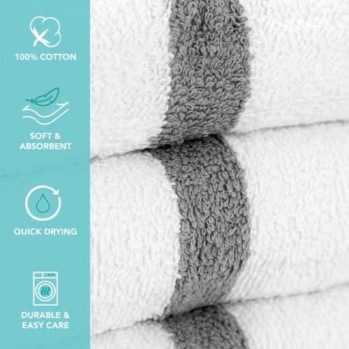 - POWER GYM BATH TOWEL VALUE PACKS: Pick up an economy set of 12 white 22" x 44" gym towels with a color center stripe. Our highly absorbent quick drying bath towels are available in plain white and blue, beige, pink, green, gold, and grey stripe.