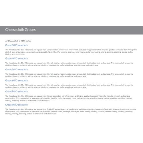 - DURABLE AND REUSABLE: This strong 100% natural cotton fabric can be washed and used again and again, which saves you money, and helps the environment too. When we talk about our 10 grade cheesecloth, one of the things that stand out is the durability and lifespan of the cloth. Not only is the cheesecloth strong, it also is reusable many times over.