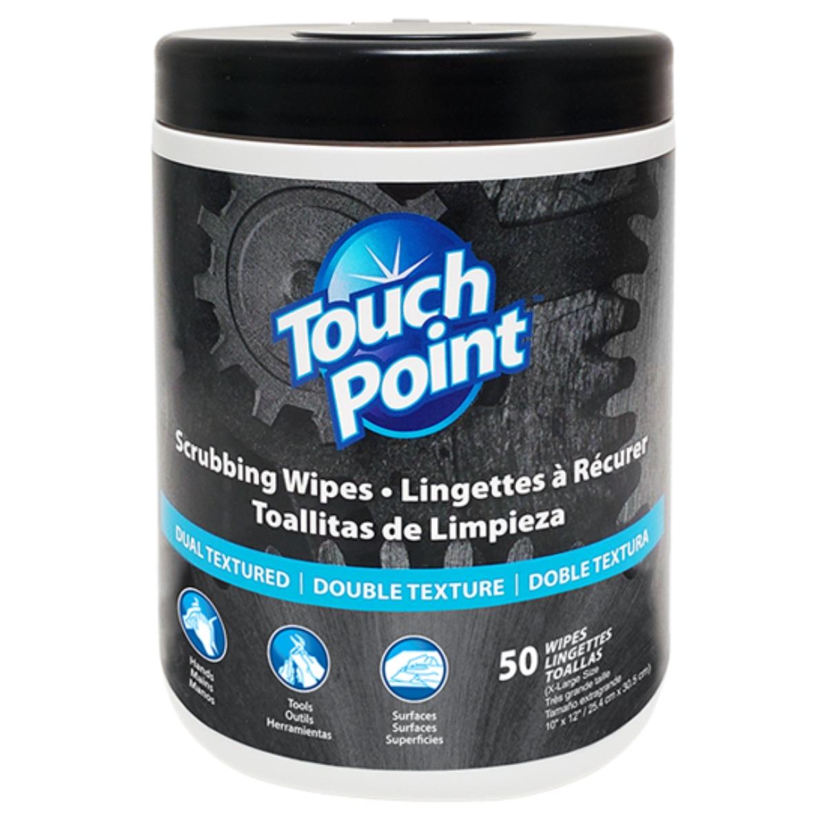 Touch Point® Scrubbing Wipes are heavy duty to handle your toughest messes quickly and easily. A dual-textured, non-scratching cloth combined with our powerful formula cuts through dirt, grease, oil, tar, paint, caulk, adhesives, and more. Use the textured side for scrubbing and the smooth side for wiping away.