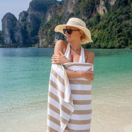 - CLASSIC CABANA TOWEL: It's a classic white terry towel with vibrant colored cabana stripes. You can't go wrong with this cabana stripe beach towel at a pool or a beach or when traveling.
