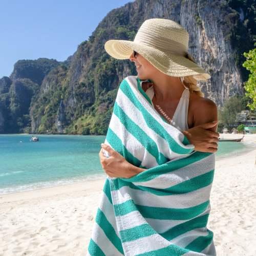 - CLASSIC CABANA TOWEL: It's a classic white terry towel with vibrant colored cabana stripes. You can't go wrong with this cabana stripe beach towel at a pool or a beach or when traveling.