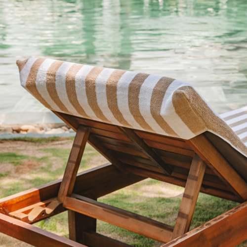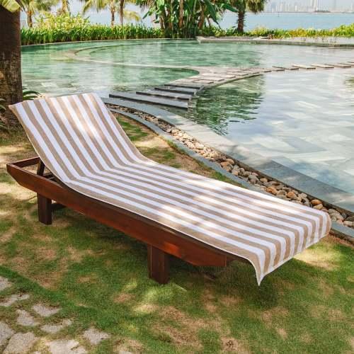 - STYLISH OUTDOOR LOUNGE COVERS: Stylish California Cabana lounge chair covers are made from soft 100% ring spun cotton with wide yarn-dyed color stripes for a unique look at the beach or pool. These plush terry pool chair covers have an 8” top pocket to keep them in place ad match our popular California Cabana beach towels for a sophisticated look.