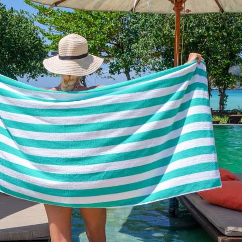 - OVERSIZED POOL TOWEL: Generously sized at 30 x 70 inches, this large beach towel features an oversized surface area for drying. Enjoy the tropical island ambiance with our most popular beach towel, the California Cabana Towel. A perfect fit for any pool cabana or beach, its bold striped pattern in vibrant summer colors adds a dash of cool summer style!