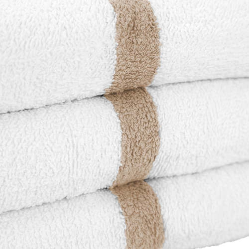- POWER GYM BATH TOWEL VALUE PACKS: Pick up an economy set of 12 white 22" x 44" gym towels with a color center stripe. Our highly absorbent quick drying bath towels are available in plain white and blue, beige, pink, green, gold, and grey stripe.