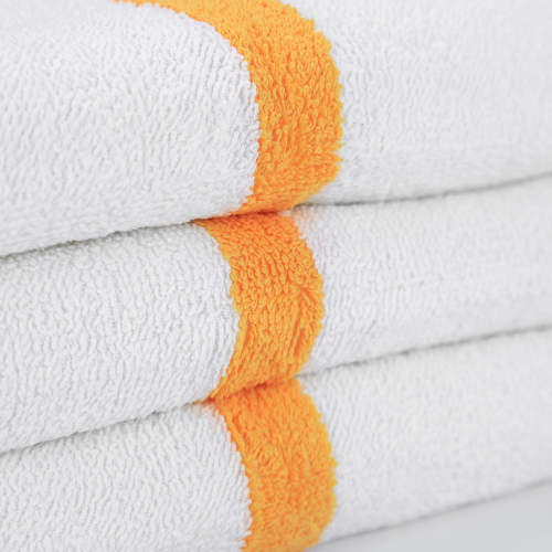 POWER GYM BATH TOWEL: Our quick-drying bath towel collection is made of 100% cotton. These top-rated small light bathroom towels were initially designed as commercial gym bath towels, and are popular hotel pool towels. Complete your towel set with our power bath towels for the bathroom. POWER GYM BATH TOWEL VALUE PACKS: Pick up an economy set of 12 white 22" x 44" gym towels with a color center stripe. Our highly absorbent quick drying bath towels are available in plain white and blue, beige, pink, green, gold, and grey stripe. A BETTER BATH TOWEL DESIGN: Our Power bath towels are made from virgin fiber 12/S open-end yarn. Standard absorbent gym towels are made from inferior blended (virgin & reclaimed) fiber yarn. There's a visible difference in the structure of our white bath towels. Power gym towel's loop pile is low, uniform, and tight, with more loops-per-square-inch than competitive towels. MULTI-PURPOSE BATH TOWEL: Our Our white quick dry towel makes a terrific gym bathroom towel, VRBO guest bath towel, or hotel pool towel. Use as an oversized hand towel in powder rooms, or to dry hair as salon towels. CARING FOR YOUR POWER BATHROOM & GYM TOWEL: These white power bath towels are machine washable on gentle cycle. Do not use bleach. Tumble dry low. Do not iron. Our soft, lightweight gym towels are easy to wash and can hold up to multiple washes without thinning or unraveling.