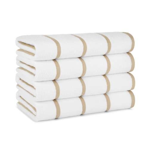 PREMIUM QUALITY BEACH TOWELS: Our Las Rayas white plush towels are made from 100% ring spun cotton and feature beautiful flat-woven horizontal stripes. ABSORBENT AND SOFT WHITE TOWELS: This 480 GSM luxury bath towel set of four is thick, soft, and absorbent. Our white beach towels wick water away fast and are considered a quick dry towel. BEAUTIFUL DESIGNED POOL TOWELS: Las Rayas luxury towels are beach, pool, or bath towels for adults. Optically bright white fluffy towels with sophisticated, colorful bath towel stripes. MULTIPURPOSE BATH TOWELS: Whether you're looking for hotel towels for bathrooms, spa towels, hotel spa towels, personal shower towels, travel beach towels, swim towels for your pool, or just a decorative bath towel, Las Rayas is one luxury towel that you cannot ignore. TERRY TOWEL CARE INSTRUCTIONS: Our large beach towels can be machine washed in a regular cycle with like colors. The colored stripes won't bleed. Our large beach towel stays soft and looks vibrant after many washes.