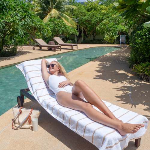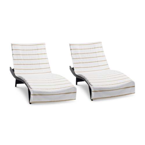 STYLISH OUTDOOR CHAIR COVERS: These Las Rayas pool chair covers are made with soft 100% premium cotton interwoven with polyester flat woven stripes for a unique look at the beach or pool. Our terry towel pool chair covers match our Las Rayas beach towels. OVERSIZED CHAISE LOUNGE COVER WITH 8" POCKET: Are you fed up when your pool towel blows off your pool chair? Our terry towel lounge chair cover is extra-large (30"x85"). The 8" terry pocket fits most beach and pool chairs so your towel will never blow away. ABSORBENT LOUNGE CHAIR COVER: Made with the same 100% ring spin cotton pile as Las Rayas bath and beach towels, Our terry lounge chair cover towel wicks water fast and dries quickly so that you can just relax after a refreshing swim. BEACH CHAIR COVERS ARE BETTER IN PAIRS: Pool goers will be jealous of your matching soft white terry chaise lounge covers. Buy a couple of two packs for the family and stake your claim to the best pool chairs. LOUNGE CHAIR TOWEL COVER WASHING INSTRUCTIONS: These oversized beach chair covers can be washed under regular machine wash and should be air-dried (preferably). Alternatively, you can dry these on the low setting in the drier. Do not use bleach or fabric softener.