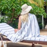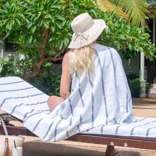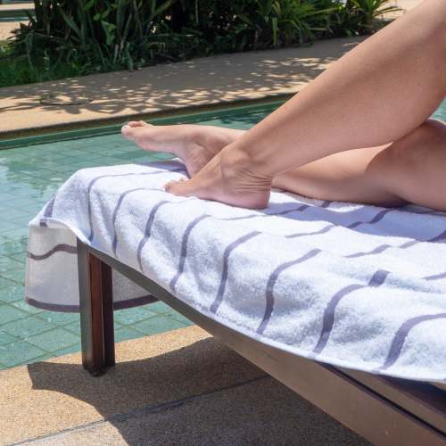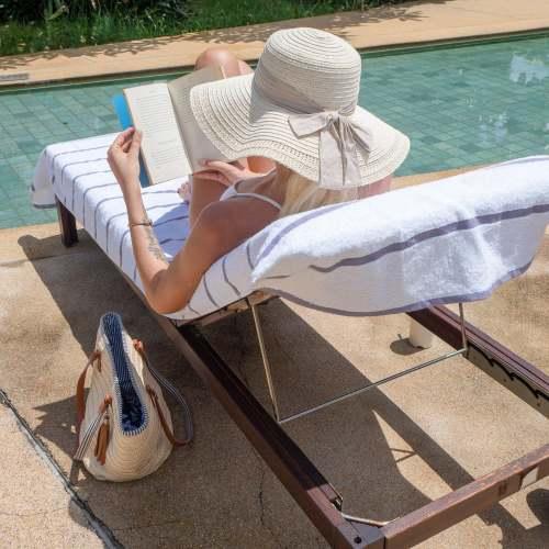 STYLISH OUTDOOR CHAIR COVERS: These Las Rayas pool chair covers are made with soft 100% premium cotton interwoven with polyester flat woven stripes for a unique look at the beach or pool. Our terry towel pool chair covers match our Las Rayas beach towels. OVERSIZED CHAISE LOUNGE COVER WITH 8" POCKET: Are you fed up when your pool towel blows off your pool chair? Our terry towel lounge chair cover is extra-large (30"x85"). The 8" terry pocket fits most beach and pool chairs so your towel will never blow away. ABSORBENT LOUNGE CHAIR COVER: Made with the same 100% ring spin cotton pile as Las Rayas bath and beach towels, Our terry lounge chair cover towel wicks water fast and dries quickly so that you can just relax after a refreshing swim. BEACH CHAIR COVERS ARE BETTER IN PAIRS: Pool goers will be jealous of your matching soft white terry chaise lounge covers. Buy a couple of two packs for the family and stake your claim to the best pool chairs. LOUNGE CHAIR TOWEL COVER WASHING INSTRUCTIONS: These oversized beach chair covers can be washed under regular machine wash and should be air-dried (preferably). Alternatively, you can dry these on the low setting in the drier. Do not use bleach or fabric softener.
