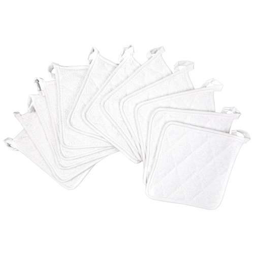 100% Cotton QUALITY: 12-pack of premium quality pot holder made up of 100% cotton (terry-looped), designed to feel soft and quilting allows for easy flexibility in these pot holders. A bulk pack of 12 make perfect for large-scale or frequent uses, offer durability and grip. A bulk pack is also more cost efficient. HEAT-RESISTANT: These pot holders will protect your hands from heat when removing dishes from the oven and hot pots from the stove, then rest your dishes on them like hot pads to protect kitchen surfaces. Do not use in a hot oven or over an open flame MULTIPURPOSE: These terry cotton oven mitts pot holders are ideal for hot pots, hot pan holder, microwave splatter guard, spoon rest, jar opener, trivet, and large coaster. Theses pot holders are perfect for business, baking, kitchen and cooking. SIZE: Our pot holders are perfect, large size - 7 x 7 in. with hemmed edges give the cloth strength and durability. It’s providing you perfect material with the benefits of heat resistant quality that you expect in your home. MACHINE WASHABLE: These pot holders are machine washable with cold water and tumble dry low (Do not bleach). Cotton makes it soft, light weight and easy to wash and can definitely hold up to multiple washes without thinning out or unraveling.