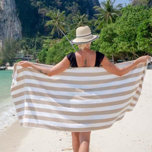 - UNIQUE CABANA TOWELS: California Cabana Towels feature bright white pile with colorful yarn-dyed stripes in vibrant trending colors. Yarn dyeing ensures that the color stripes in this bold beach towel won't run or fade in the sun. This highly popular caba