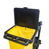 The Impact® Black Janitor Cart T0047-00 delivers reliable performance and organization for professional cleaning teams. Featuring a front platform sized to fit a standard 32-gallon trash container, this janitorial cart keeps waste collection centralized and efficient. A covered bin with odor-containing design, foldable handle for compact storage, adjustable middle shelf for customizable supply placement, and additional storage space help streamline daily tasks. Combining robust construction with smooth maneuverability, it supports housekeeping operations in schools, offices, hospitality venues, and healthcare facilities — reducing trips and improving productivity across any environment.
