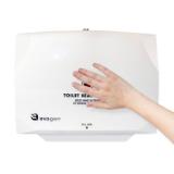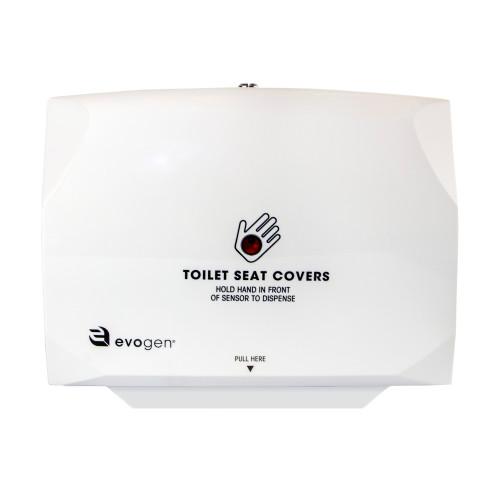 Introducing the Evogen® high-capacity hands-free toilet seat cover dispensing system. Increased capacity translates into cost savings with less service time required to maintain. The system is fully contained, that is, there is no unhygienic pre-displaying of product. Instead, all seat covers are kept clean inside the dispenser. Then, with a wave of the hand, a single cover is dispensed automatically. And the seat cover is presented from the dispenser in full and ready to use — not folded and no tabs to tear. US Patent Nos. 10,888,203 and 11,109,724.