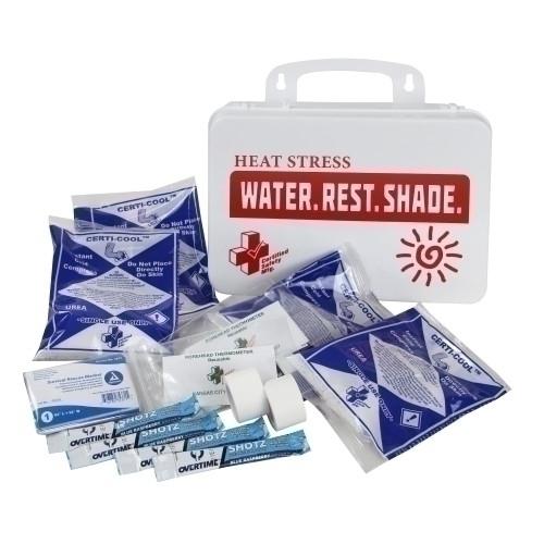 - Keeping first aid kits on hand and readily available in the event of heat stress is important for employee safety.