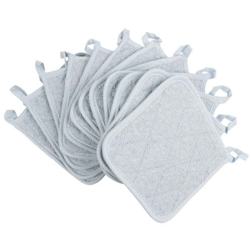 100% CottonQUALITY: 12-pack of premium quality pot holder made up of 100% cotton (terry-looped), designed to feel soft and quilting allows for easy flexibility in these pot holders. A bulk pack of 12 make perfect for large-scale or frequent uses, offer durability and grip. A bulk pack is also more cost efficient.HEAT-RESISTANT: These pot holders will protect your hands from heat when removing dishes from the oven and hot pots from the stove, then rest your dishes on them like hot pads to protect kitchen surfaces. Do not use in a hot oven or over an open flameMULTIPURPOSE: These terry cotton oven mitts pot holders are ideal for hot pots, hot pan holder, microwave splatter guard, spoon rest, jar opener, trivet, and large coaster. Theses pot holders are perfect for business, baking, kitchen and cooking.SIZE: Our pot holders are perfect, large size - 7 x 7 in. with hemmed edges give the cloth strength and durability. It’s providing you perfect material with the benefits of heat resistant quality that you expect in your home.MACHINE WASHABLE: These pot holders are machine washable with cold water and tumble dry low (Do not bleach). Cotton makes it soft, light weight and easy to wash and can definitely hold up to multiple washes without thinning out or unraveling.