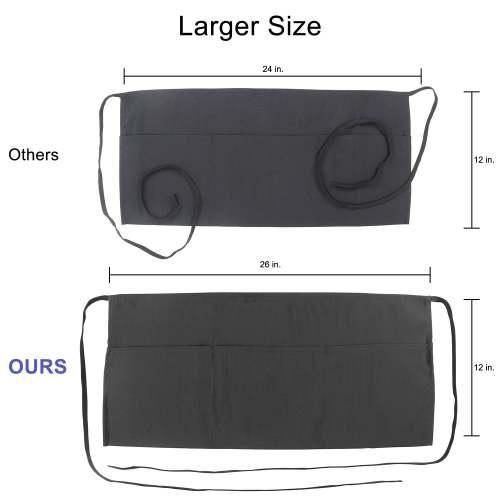 Spun Polyester QUALITY: Our Mariposa 3 Pocket Waist Aprons collection is made from 100% Spun Polyester, designed to feel soft. These professional waist aprons are touch, economical and have large pocket with enough space for storage. FEATURES: Our 3 Pocket Waist Aprons are made for everyday wear and tear. Our Long 3 Pocket Waist Apron is the perfect addition for any waiter, waitress, or banquet server. Waist aprons include pockets so your waitstaff is able to have pens, guest checks, and beverage straws close at hand. MULTIPURPOSE: Suitable for restaurants, cafes, serving, kitchens, hotels, crafting and gardening, hairdressers, barbers and cosmetology industry, etc. Our pocket waist aprons easily store pens, pads, combs, brushes, hair clips, shears, tools, utensils, scissors and more. SET OF 12: 12-pack of commercial-grade aprons provides convenient storage for whatever your industry needs at hand. These aprons are durable and will maintain your professional appearance. Long waist ties make these fit for any body type, owing to the adjustable ties, can be tied at the back and is comfortable to use. MACHINE WASHABLE: Machine washable with warm water, Tumble Dry Low (Do not bleach). Color will not bleed, fade or transfer. Serve apron should be washed and dried often, and our waist apron will hold up to multiple washes without thinning out or unraveling.