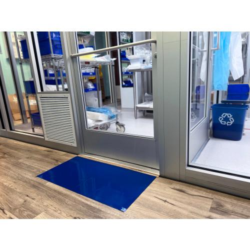 Blue Sticky Mat for Cleanroom, Industrial / Construction, and Maintenance | Tacky Traxx - The Ultimate Disposable Sticky Entrance Mat Our Tacky Traxx Blue Sticky Mat is the ultimate solution to maintaining cleanliness in a variety of industries. These blue sticky mats (sometimes referred to as Blue Tacky Mats ) contain 30 layers of clean adhesive film and packaged four mats per case. They are designed to remove dirt and other particulate from foot and cart traffic upon entrance into a controlled environment. They are a bright blue color making them easy to identify. Each mat contains 30 individually numbered sheets that easily peel of , revealing an new layer underneath. Sticky mats are a vital tool for controll ng contamination in cleanrooms and other applications that need to eliminate dirt and dust from outside sources. In addition to our stocked options, we of er custom, private label, drop shipping, and contract manufacturing services - Please Contact Us for more information. Why Choose a Blue Tacky Floor Mat? A blue mat is a good choice for facilities with light colored floors. The bright blue color helps make the mat visible which can reduce tripping and further encourage workers to walk on it. This color is also good for identifying when the sheet needs to be changed. Features and benefits: Numbered corner tabs for easy tracking of remaining sheets. Smooth, effective surface is not damaged by shoes, booties, or cart wheels. Peel-of sheets eliminate the need for messy cleaning and make it easy to maintain a clean surface. Perfect for cleanrooms, laboratories, construction, manufacturing, maintenance / installation service, and residential use Installation: Peel of the protective layer of film on the back side of the mat (opposite side that the numbers face) to reveal the adhesive backing Place the mat on a clean surface in the desired location Peel of the top layer of protective film revealing the first sheet of the mat (number 30)