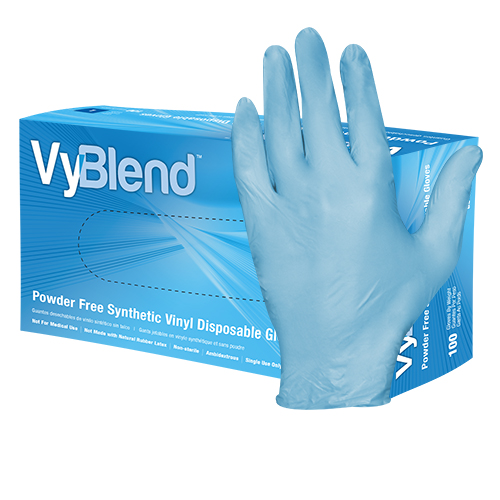 VyBlend Synthetic Vinyl Disposable Gloves, Powder-Free, 4.5 mil. These gloves are softer and more durable than a standard vinyl glove, offering better dexterity and comfort for the user. A small amount of nitrile added to the glove formulation enhances the vinyl tensile strength, elongation and feel. They are perfect for a variety of industrial and general-purpose applications. They are sold by the case - packaged 100/box, 10 boxes/case, 1000 total gloves per case.