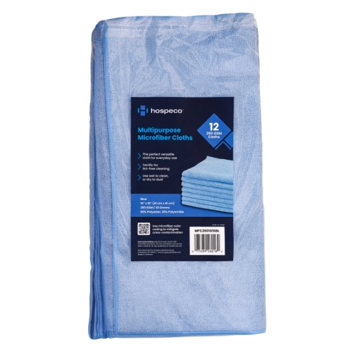 The Hospeco® 16x16 260GSM Microfiber Cloth is built for daily cleaning with balanced absorbency. Made from 80% polyester and 20% polyamide, split fibers lift and hold dust, dirt, and liquid for fewer passes. The medium weight handles glass, counters, and metal without lint in wet or dry use. Reusable and machine washable, supports color-coded systems to reduce cross-contamination. Blue color for windows and hallways.