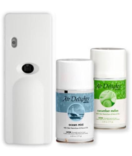 This aerosol air freshener dispenser is a reliable, easy-to-use solution for maintaining a consistently fresh environment in commercial and high-traffic spaces. Designed to fit virtually all standard metered aerosol cans, this sturdy white dispenser delivers a 15-minute spray interval that helps keep unwanted odors under control throughout the day. It includes intuitive features like an empty can reminder after 3,000 sprays and a low battery indicator, while the push-button design and chemical-resistant plastics make operation simple and durable. Powered by two D-cell alkaline batteries (not included) and recommended for areas up to 6,000 cubic feet, this dispenser offers dependable performance with minimal upkeep — ideal for restrooms, lobbies, and other public spaces that benefit from continuous fresh-scent coverage.