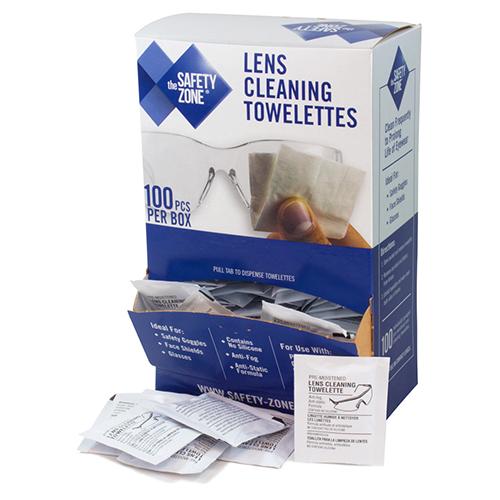 The Safety Zone® Lens Cleaning Towelettes (ES-LCT) provide fast, effective cleaning for all types of eyewear and protective lenses. Each pre-moistened towelette features a powerful anti-fog and anti-static formula that safely lifts away dust, smudges, and residue from glass, plastic, and polycarbonate surfaces — all while preserving lens coatings and clarity. Designed for safety goggles, face shields, glasses, and other protective gear, these silicone-free wipes help maintain clear vision and optimal performance throughout the day. Convenient and ready to use, they support cleaner, safer workplaces in industrial, healthcare, laboratory, and facility environments.