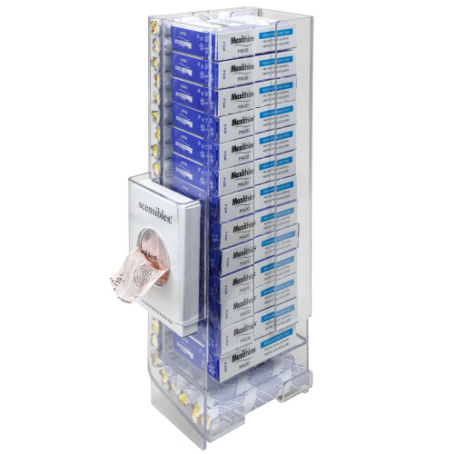 - Dual dispensing system holds pads, tampons, and personal disposal bags