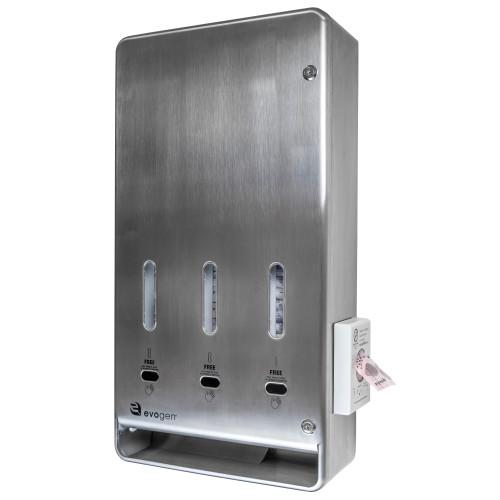 - The Evogen® Tri-Vend High Capacity No-Touch Menstrual Care Product Dispenser is designed to reduce the spread of germs and illnesses in public restrooms.