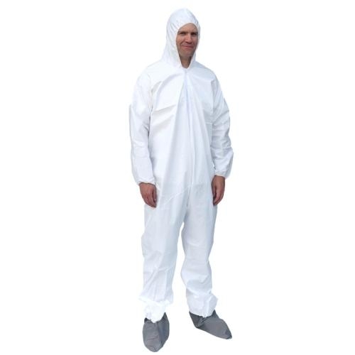 - Disposable, hooded coveralls with boots made from a microporous film laminate.